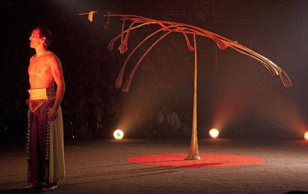 A question of balance: Balance ist kein Zustand – Balance ist Bewegung. In seiner begnadeten Sanddornbalance legt der Schweizer Rigolo 13 Palmäste zu einer schwebend leichten Skulptur zusammen. Hier trifft archaisch-ritueller Tempeltanz auf Zirkuspoesie. „Die Welt gerät aus den Fugen, wird aus den Angeln gehoben. Zwischendurch, nur selten, geschieht oder gelingt uns ein Moment des Gleichgewichts, des Glücks – Balance…“ Die Faszination dieser Momente hat Mädir Eugster, so der bürgerliche Name des Künstlers, nie losgelassen. Der moderne Schamane ließ mit Schweizer Präzision fantastische Objekte entstehen, die in genialer Einfachheit die tiefe Symbolik des Gleichgewichts darstellen. Schon seit Jahrzehnten befasst sich der Begründer und Leiter der Schweizer Tanztheater-Formation Rigolo mit dem Phänomen der Ausgeglichenheit.