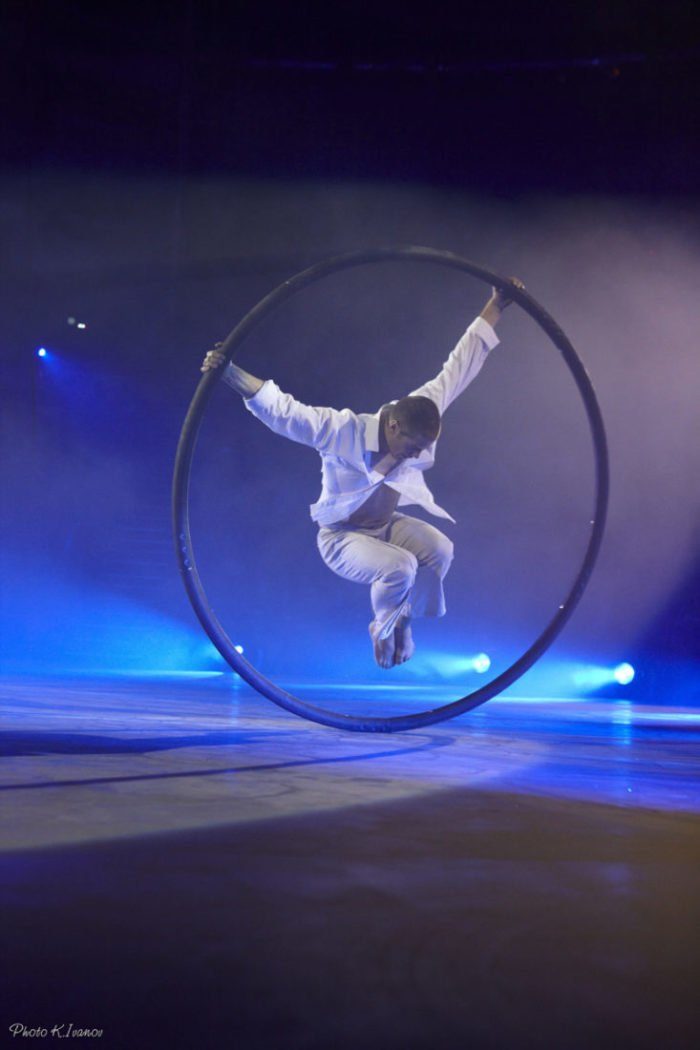 Dreht am Rad: Der Kreis ist die perfekte Form. Nicht nur in der Geometrie. Er steht für Unendlichkeit, Kontinuität, für das Leben … Diesen Kreislauf interpretiert Hugo Noel aus Kanada auf seine Art und nutzt dazu das noch gar nicht so lange in der Manege beheimatete Cyr. Das Riesenrad ist vergleichbar mit dem Rhönrad, aber um einiges riskanter zu bewegen. Der ehemalige Cirque du Soleil Artist macht daraus mit Leichtigkeit und einem Schuss Poesie eine runde Sache. Dafür gab es bereits Edelmetall bei Festivals in aller Welt. Neben seinem Auftritt mit dem Cyr zeigt Hugo Noel sein Können auch bei den Darbietungen der Catwall Acrobats, entwickelt Darbietungen für andere Künstler und konstruiert Requisiten vom Schleuderbrett bis zum zerlegbaren Cyr.
