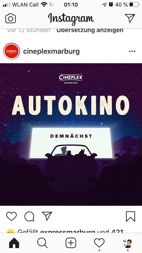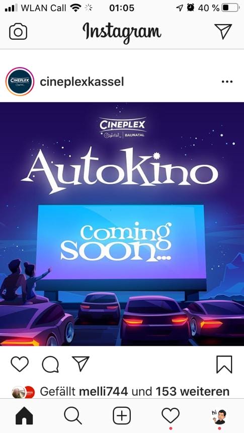 Erst hieß es „Geht in Hessen leider nicht!“ Doch kurze Zeit später wurden auf den Facebook-Seiten der beiden Cineplex-Kinos in Marburg und Kassel auch Autokino-Events angekündigt (siehe unten).