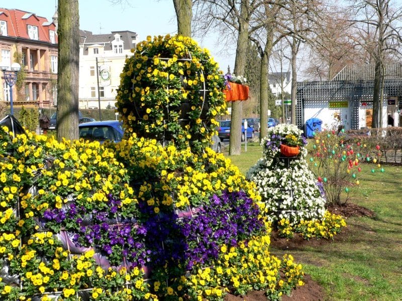 Echte Hingucker sind auch die überdimensionale blütengeschmückte Entenfamilie und ein gut drei Meter großes, bepflanztes Blumen-Osterei auf der Brunnenallee, weiter oben „spielen“ kunstvoll gestaltete Küken, Hühner und Osterhasen in einem geräumigen Nest. Auf der Promenade haben fleißige Gärtner einen riesengroßen Wildunger Wappenstern aus Stiefmütterchen gestaltet und im Kurstadtteil Reinhardshausen werden die Besucher entlang der Hauptstraße von einer farbenfrohen Allee aus Dutzenden lebensgroßer handbemalter Osterhasenfiguren begrüßt.