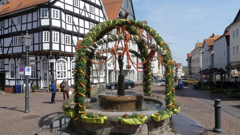 Das sind große Brunnenanlagen, wie beispielsweise der Marktbrunnen auf dem fachwerkumsäumten Altstadt-Mittelpunkt, die anmutige Brunnen-Nymphe als Wahrzeichen der Stadt, der Mosaikbrunnen am Fürstenhof, der stadtbildprägende „Kurschattenbrunnen“ oder die hübsche Springbrunnenanlage am „Kaiserhof“, die mit filigranen Metallkonstruktionen überspannt und erweitert werden, um die Frühlingsdekoration aufzunehmen. Mit viel Liebe zum Detail und tollen Ideen entstand in wochenlanger Arbeit eine faszinierende Symphonie aus Farben und Fantasie aus unterschiedlichsten Deko-Elementen, Girlanden, bunten Eiern und blühenden Blumen.