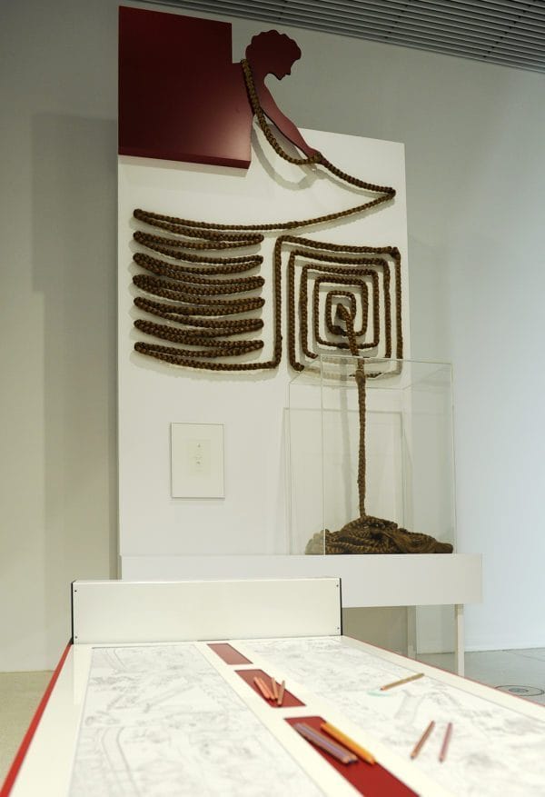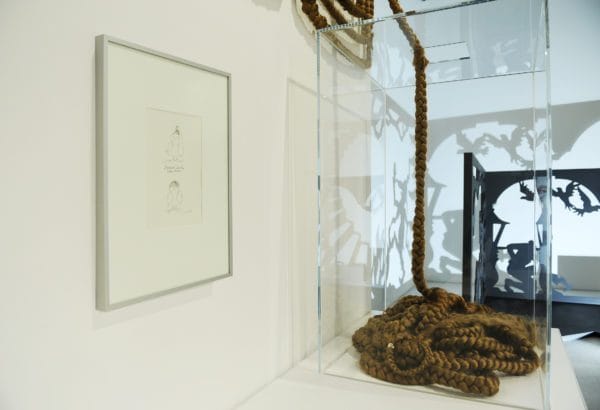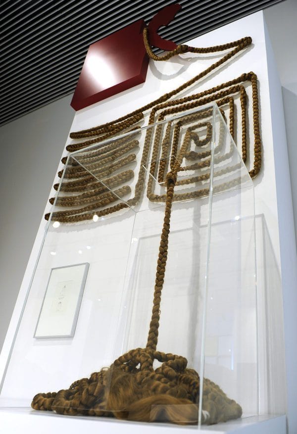 Vorher kommt der Besucher noch an einem 53 Meter langen Rapunzelzopf vorbei; ein Kunstwerk, das die GRIMMWELT Kassel kürzlich erworben hat. Vom Künstlerehepaar Khanous-Zobel aus Köln aus blondem Kunsthaar gewebt und geflochten, trägt es den Titel »Hommage an die Brüder Grimm«. Der Rapunzelzopf windet sich in zahlreichen Schleifen und Kurven den hohen Turm hinab. Darunter findet sich das »Rapunzel« des bekannten Künstlers F.K. Waechter aus der Grimm-Sammlung der Stadt Kassel. Der Zeichner, Karikaturist, Cartoonist und Autor von Kinderbüchern und Theaterstücken gibt der bekannten Märchenthematik hier eine ganz eigene überraschende Wendung.