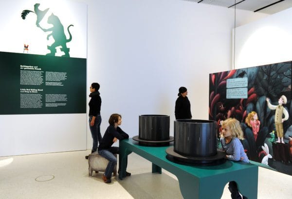 Gleich zum Eintritt in die Welt der Märchen steht eine Entscheidung: Groß oder klein? Durch welchen Eingang gehe ich? Märchen sind voller Wunder und Überraschungen: Riesiges wird plötzlich winzig klein, Bedrohliches ist eigentlich ganz harmlos und selbst die Gesetze der Schwerkraft gelten nicht mehr. Der erste Bereich »Rotkäppchen und der gestiefelte Frosch« zeigt die Beziehungen zwischen Mensch und Tier in den Grimmschen Märchen auf und handelt von den Verwandlungen vom einen in das andere. Die »Zoetrope« mit Illustrationen von Katrin Nicklas zeigen die Verwandlungen von Jorinde zur Nachtigall und vom Prinzen zum Bär.