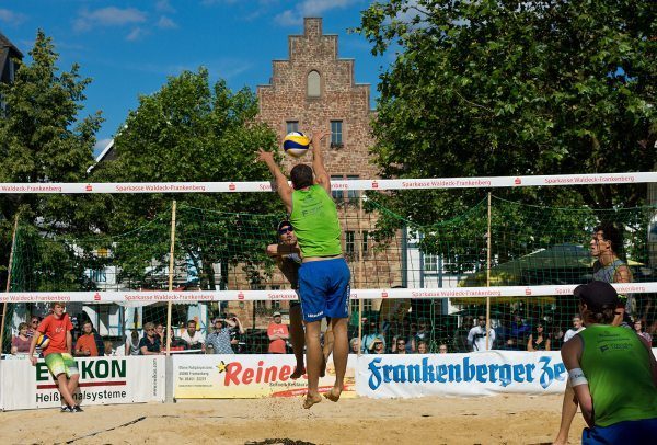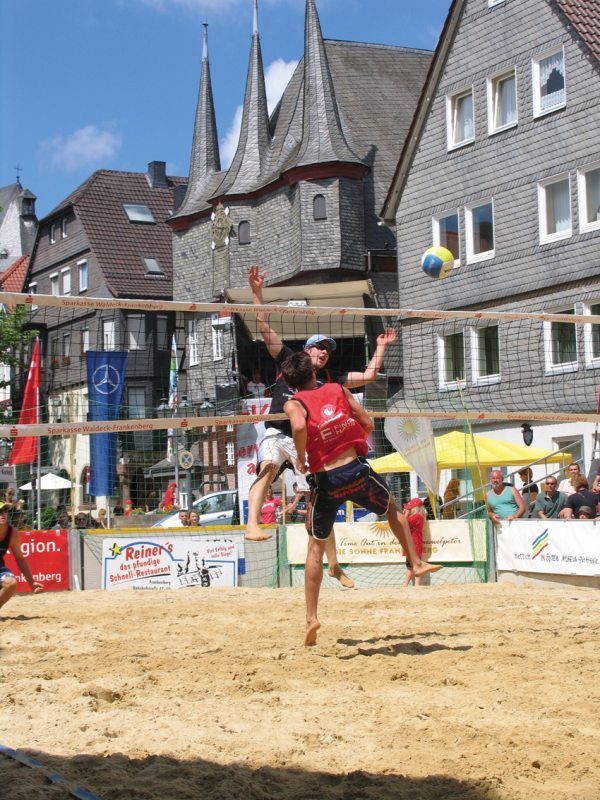 Bereits zu 18. Mal wird der Sparkassen-Beach Cup ausgetragen und gehört seit Jahren zu den Highlights im Frankenberger Veranstaltungskalender. Die besondere Atmosphäre auf dem Obermarkt im Herzen der historischen Altstadt Frankenbergs ist nicht nur für die Zuschauer dieser spektakulären Sportart einzigartig, auch die Sportler sind immer wieder begeistert von der Kulisse, der Stimmung und der Organisation des Turniers.