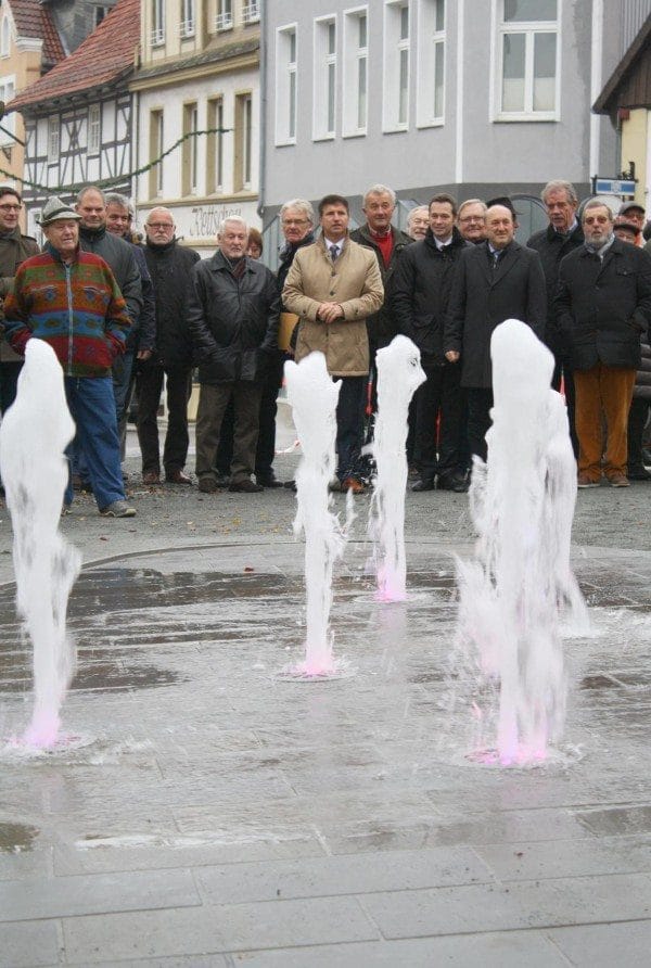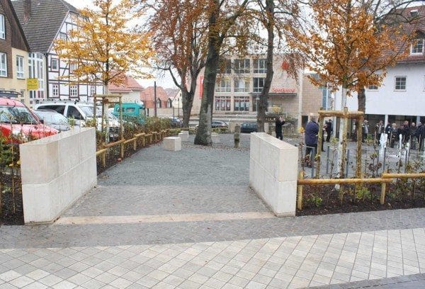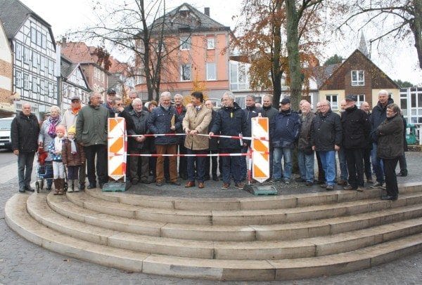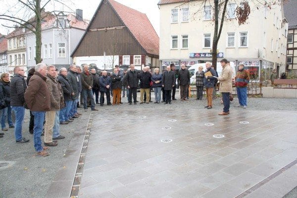 Weiterhin ging der Bürgermeister in seinem Grußwort, welches er auch zur Danksagung an die bei der Planung und Umsetzung der Umgestaltung beteiligten Unternehmen nutzte, auch auf die Historie des Gebrüder-Warburg-Platzes ein. So wies er darauf hin, dass der Platz im 16. Jahrhundert Standort eines kleinen Friedhofes gewesen sei, woran noch heute ein an gleicher Stelle belassenes Pestkreuz erinnere.