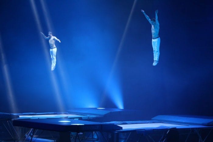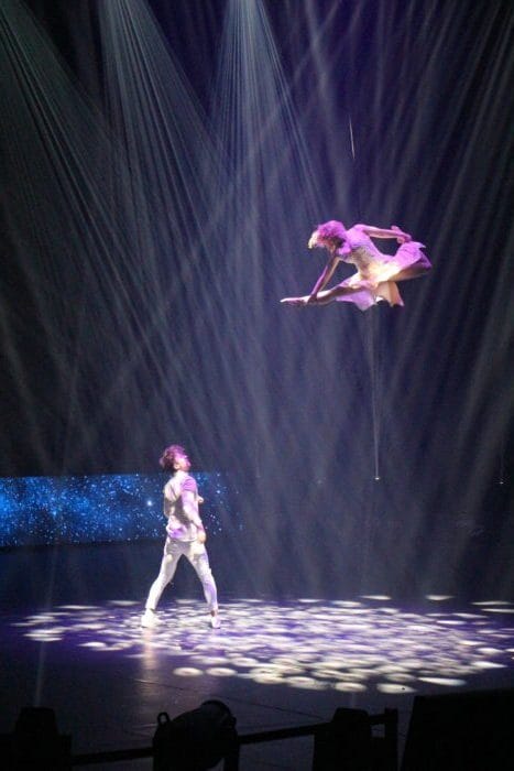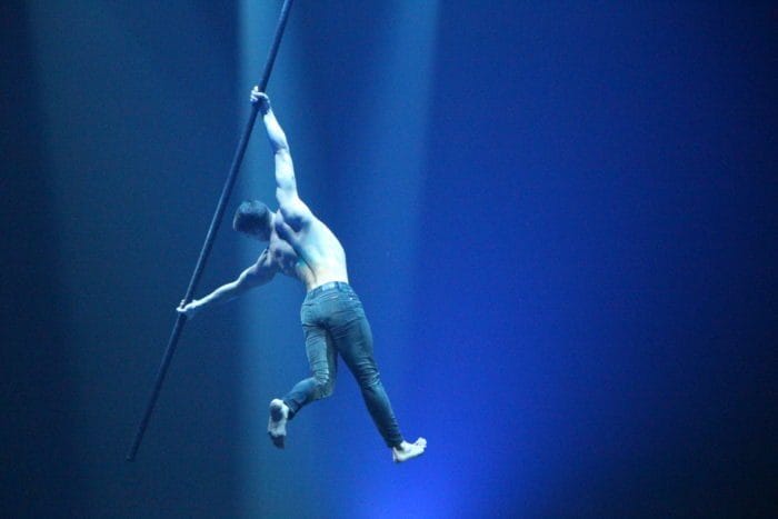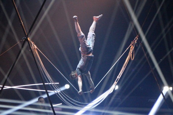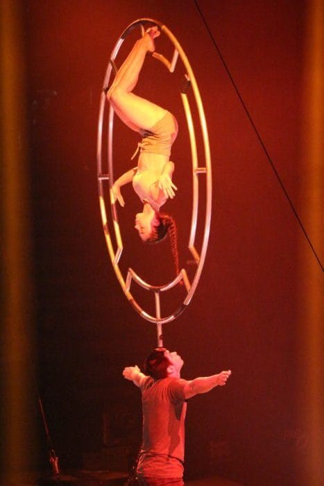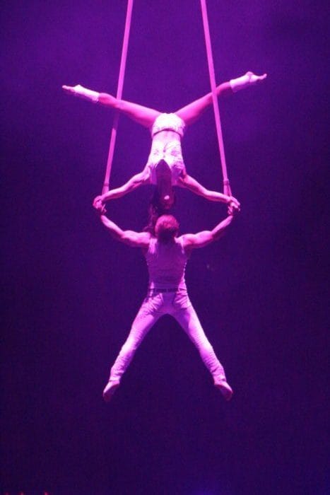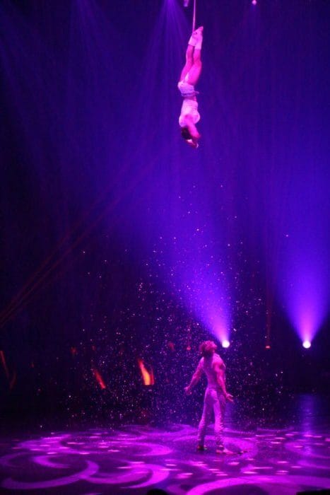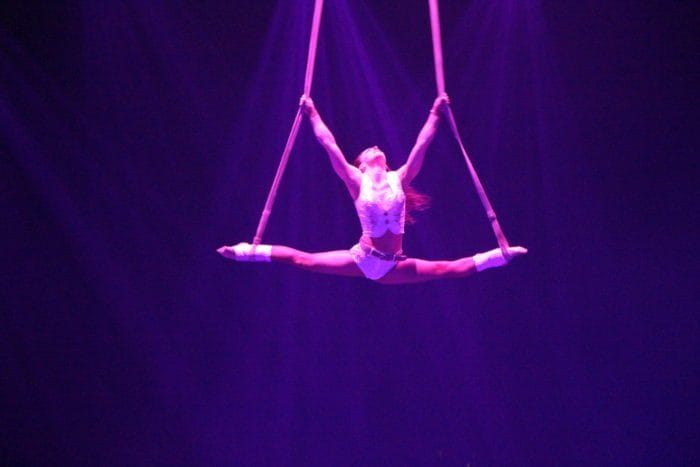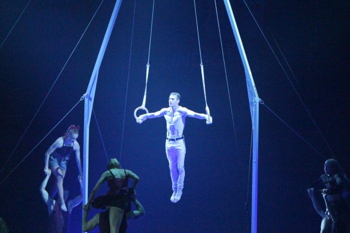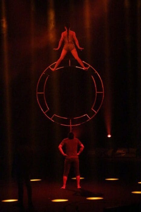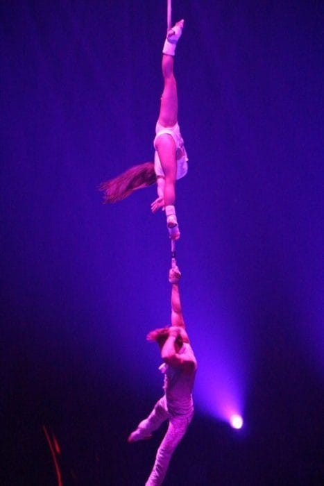 Es ist dunkel. Laserhafte Lichter blitzen durch den Raum. In der Mitte schwebt eine Frau an einem Seil hängend in der Manege. Alle halten den Atem an. Plötzlich rutscht die Frau an dem Seil hinab und kann sich mit dem Fuß knapp darin halten. Ein heftiges Einatmen und ein kleiner Aufschrei geht durch das Publikum.