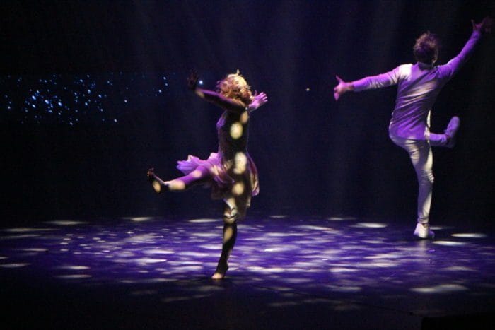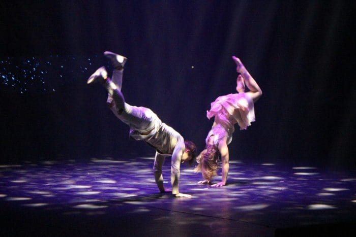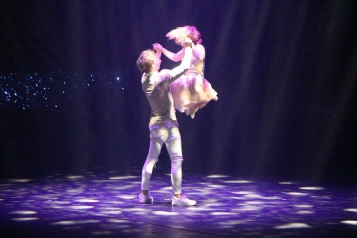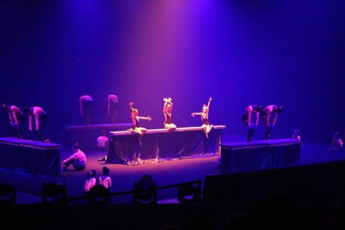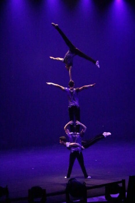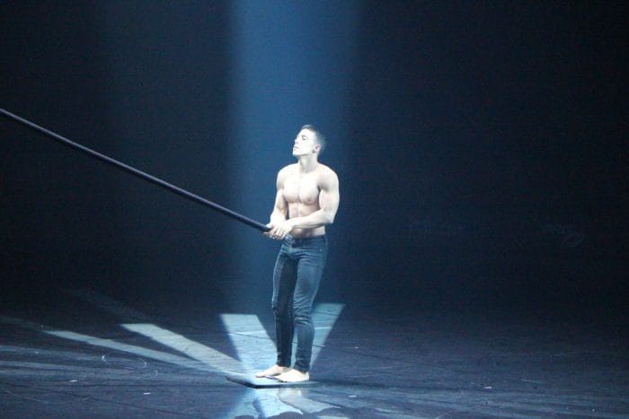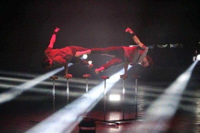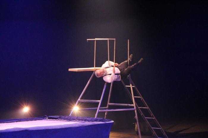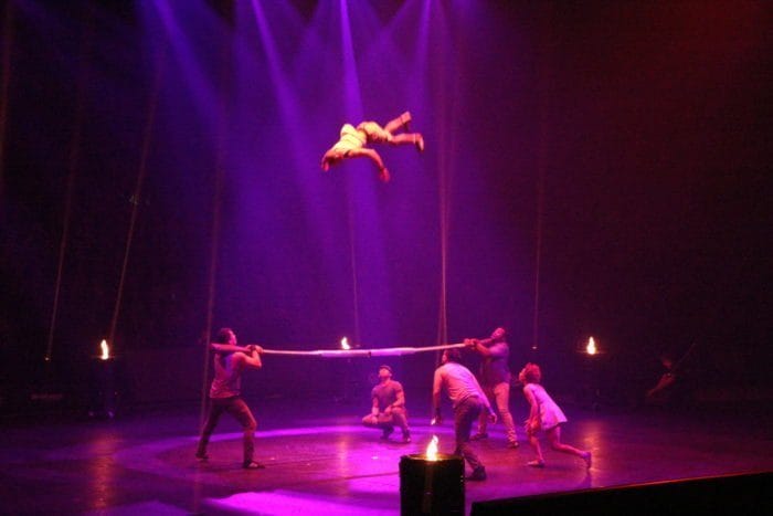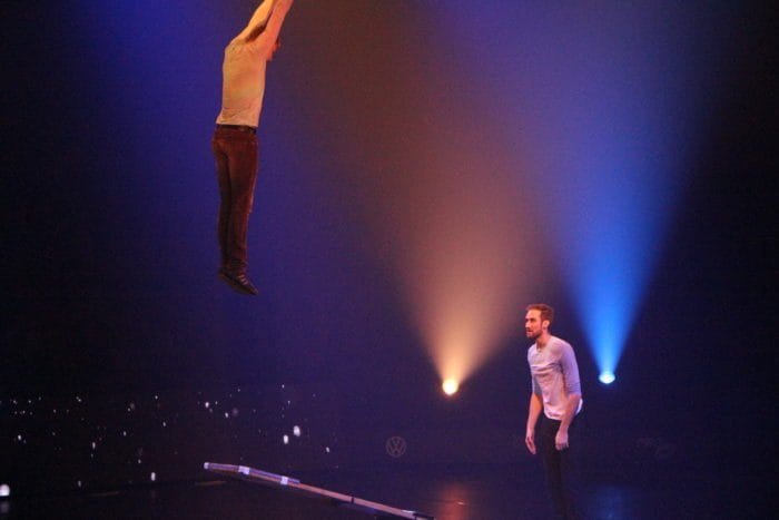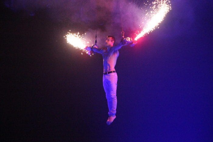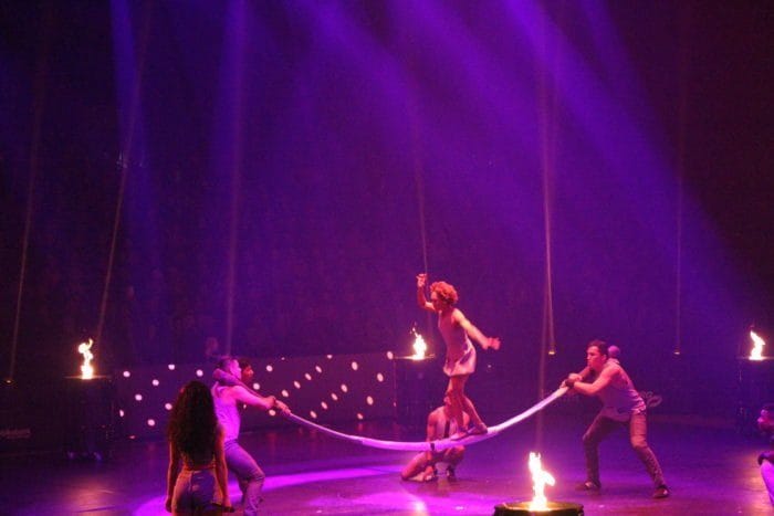 Es ist dunkel. Laserhafte Lichter blitzen durch den Raum. In der Mitte schwebt eine Frau an einem Seil hängend in der Manege. Alle halten den Atem an. Plötzlich rutscht die Frau an dem Seil hinab und kann sich mit dem Fuß knapp darin halten. Ein heftiges Einatmen und ein kleiner Aufschrei geht durch das Publikum.
