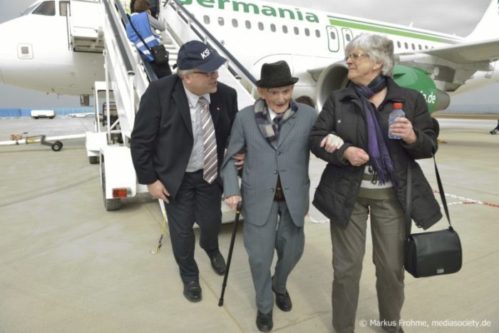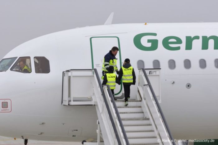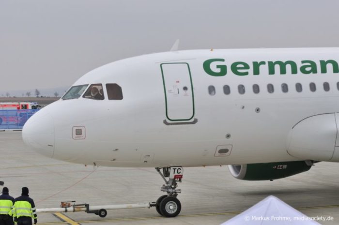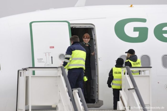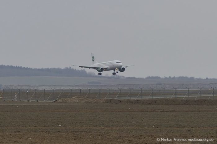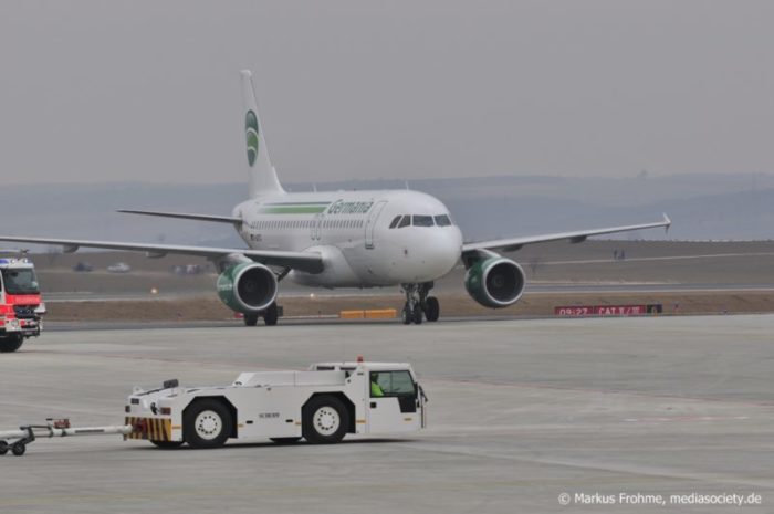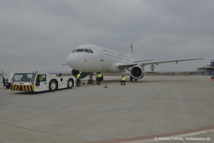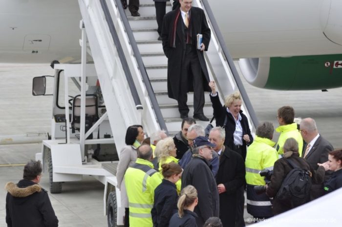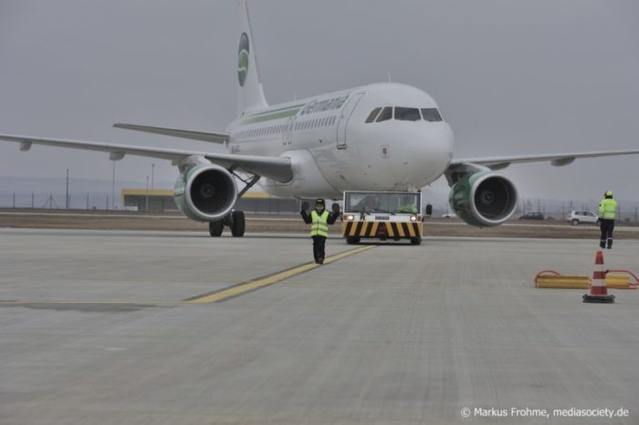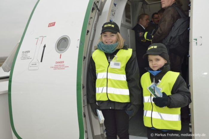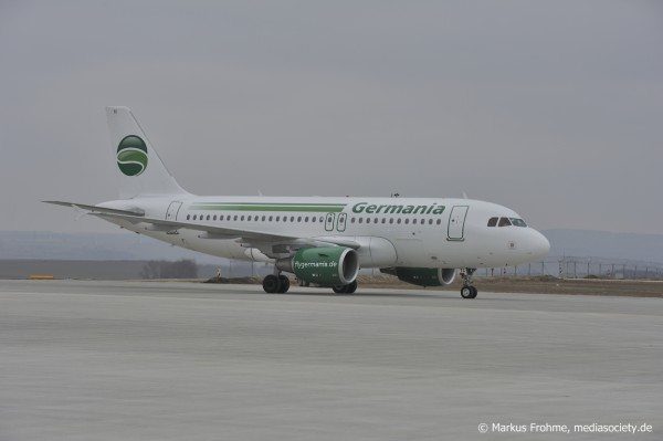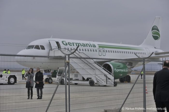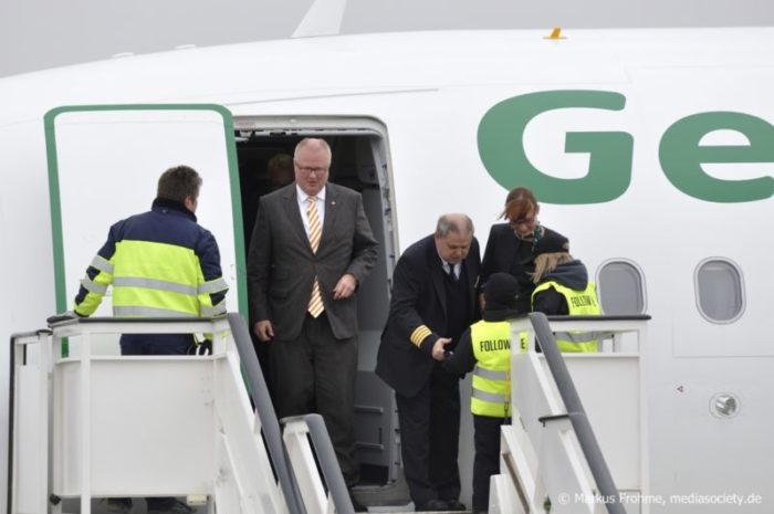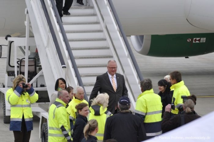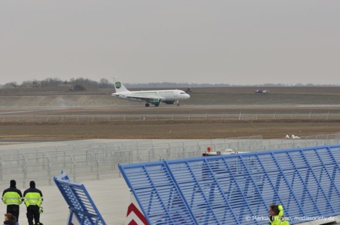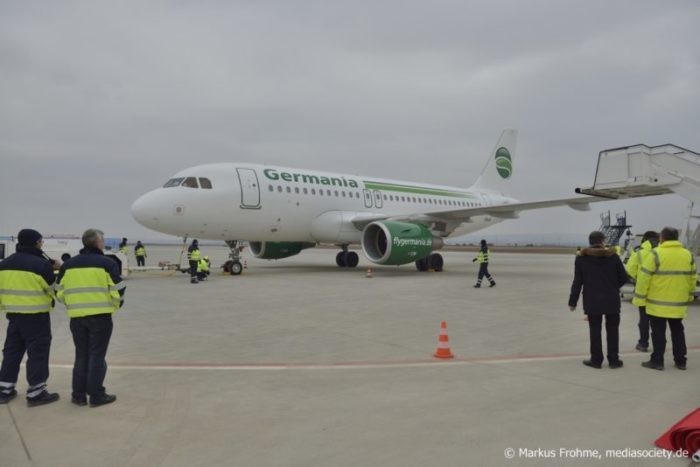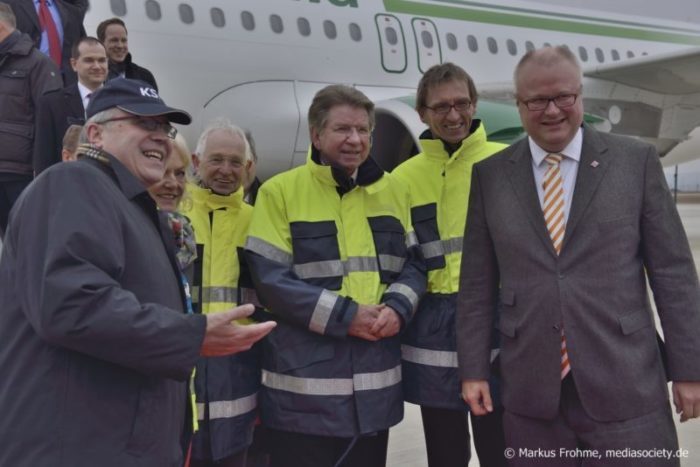 Eigentlich ist es ja Tradition, dass die Flughafenfeuerwehr die erste Maschine mit einer Fontäne aus ihren Wasserschläuchen begrüßt – das kalte Wetter machte dem Caldener Flughafen da einen Strich durch die Rechnung. Trotzdem setzte um 11.11 Uhr die Maschine der Airline Germania butterweich als erste große Passiermaschine auf dem neuen Rollfeld auf.
