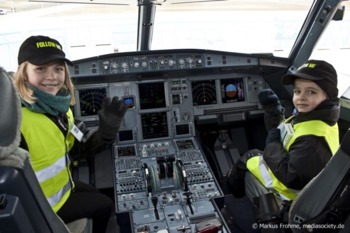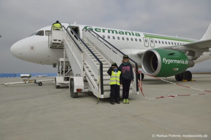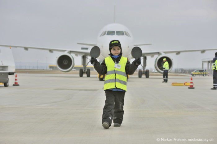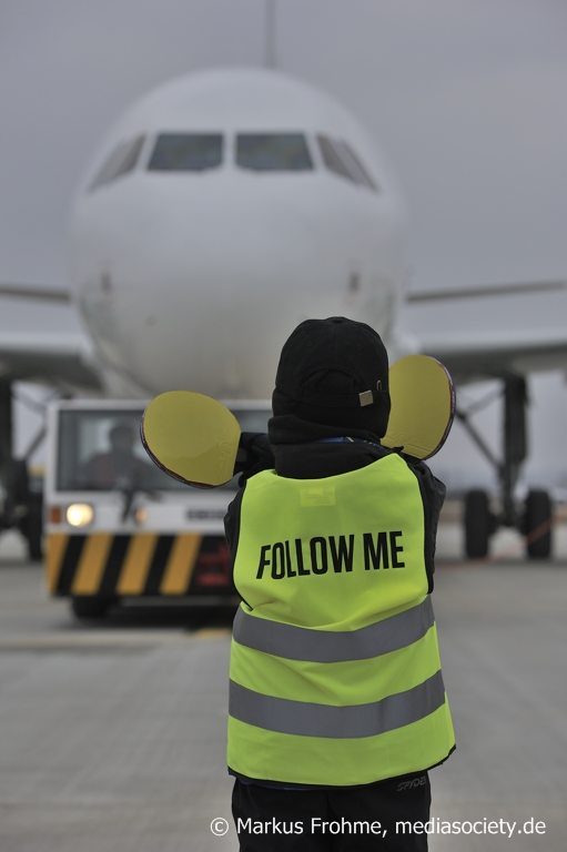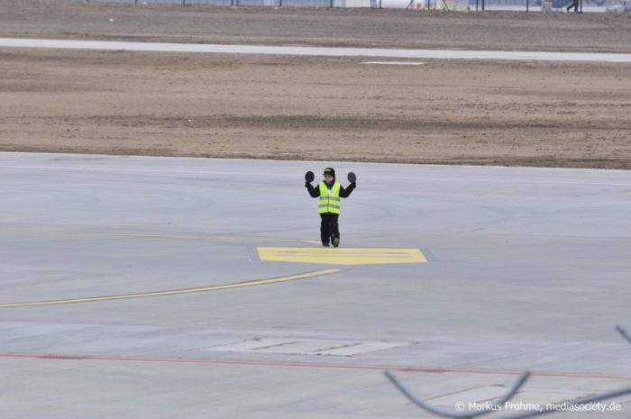Der Flughafen Kassel-Calden (KSF) ist seit dem 4.4. offiziell fertiggestellt und eingeweiht. Nach ihrer Landung rollte der Airbus A319 in seine Parkposition neben dem Festzelt- dorthin gelotst wurde sie vom erst fünfjährigen Sten, der an diesem Tag anstelle seines Vaters, der eigentlich beim Flughafen arbeitet, die Kellen schwingen und das Flugzeug einwinken durfte. Hinter dem kleinen Jungen wie ein überdimensionaler Hund der riesige Blechvogel.