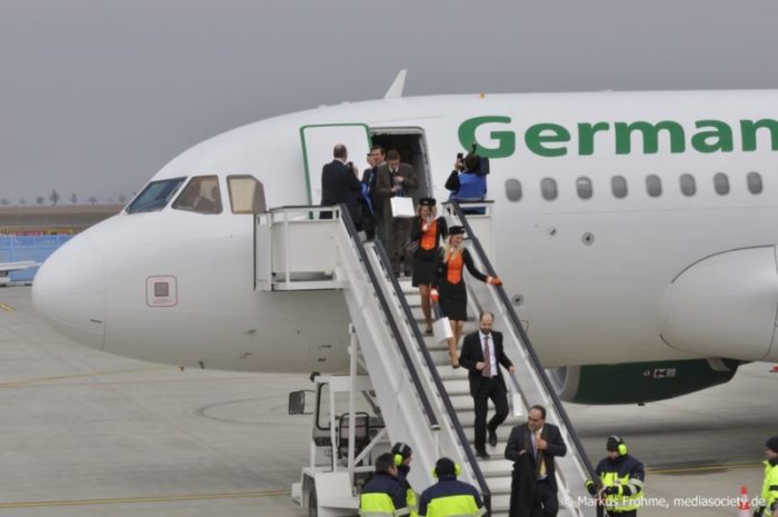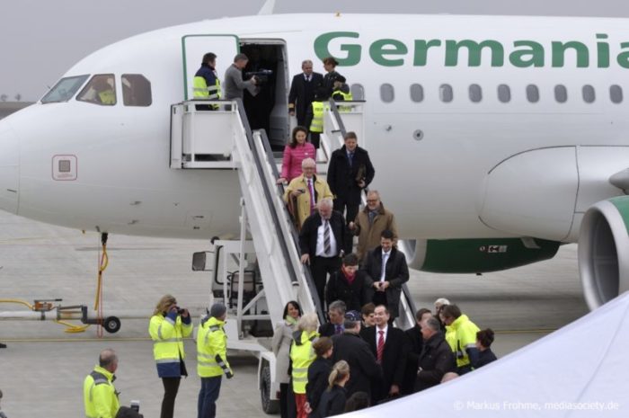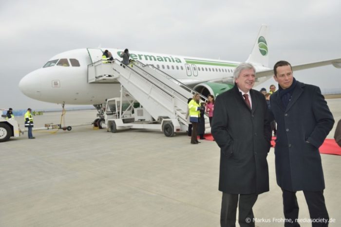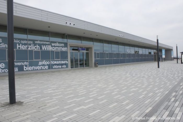 Die Maschine war aus Frankfurt gekommen. An Bord Journalisten und Ehrengäste, darunter der Nordhessische Finanzminister Dr. Thomas Schäfer, der zugleich auch Aufsichtsratsvorsitzender des neuen Flughafens ist. Der Sprecher der Geschäftsführung, Jörg Ries, eröffnete den Reigen der Festreden. Er begrüßte seine Gäste mit den Worten „Ich darf verkünden: Wir haben fertig!“ Aufgrund der anhaltenden Kritik am Flughafen sagte er in seiner Festrede, dass auch der Güterbahnhof und der ICE-Bahnhof in Kassel, ausgerechnet Kassel, sehr umstritten geweisen seien und sich trotzdem etabliert hätten und nicht mehr wegzudenken seien.