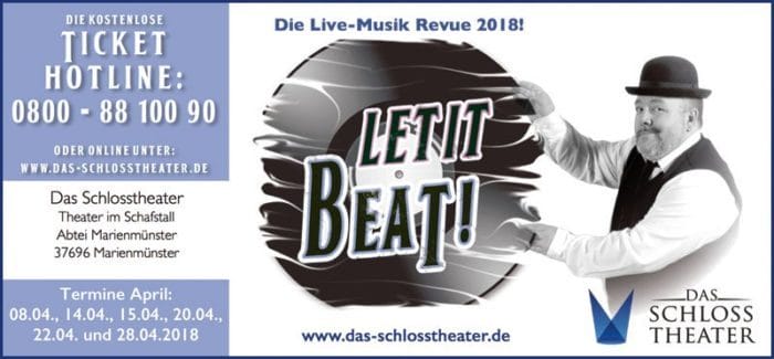 Ab sofort können wieder Karten für das aktuelle Musical „Let it Beat!“ vom Schlosstheater gekauft werden! Am 8., 14., 15., 20., 22., und 28. April um jeweils 19:30 Uhr findet die Aufführung statt. Das Musical ist eine Hommage an den Britpop der 60er Jahre bis heute – von The Beatles über The Rolling Stones bis Queen. Wie der Abend verläuft, lässt sich dabei interaktiv mitgestalten. Tickets für das Musical, das im Schafstall Marienmünster aufgeführt wird, gibt es an allen bekannten Vorverkaufsstellen und auf der Homepage des Veranstalters.
