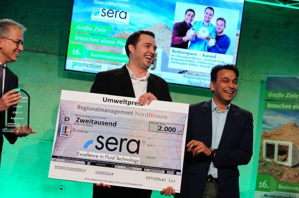 Über den Sonderpreis Dezentrale Energien und damit 2.000,- Euro kann sich prosumergy aus Kassel freuen, die den 4. Platz im Wettbewerb belegt. Damit wird die Idee, die Nutzung Solarstrom vom eigenen Dach auch Mietern zu ermöglichen, zusätzlich honoriert. Der von sera gesponsorte Umweltpreis geht an die Firma Betterspace für ein intelligentes System zur automatisierten Steuerung der Heizung in Hotel- und Büroräumen (Platz 2 im Wettbewerb).