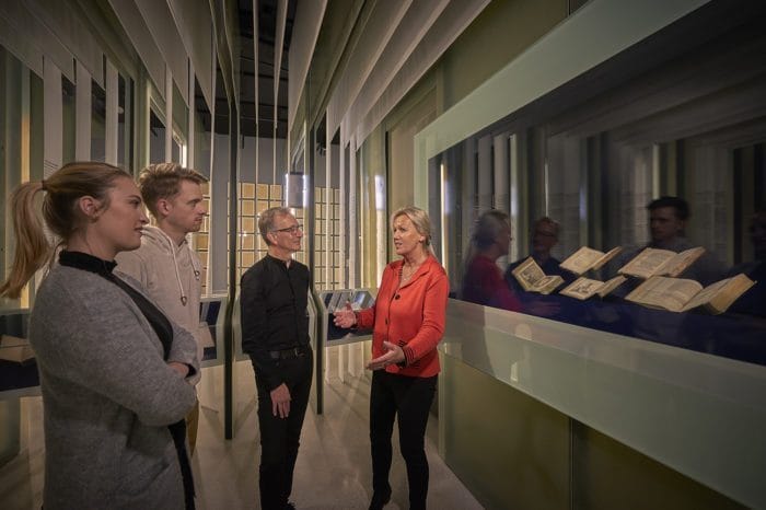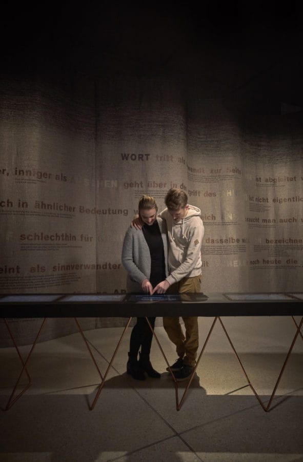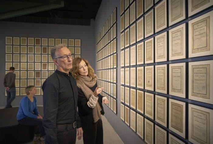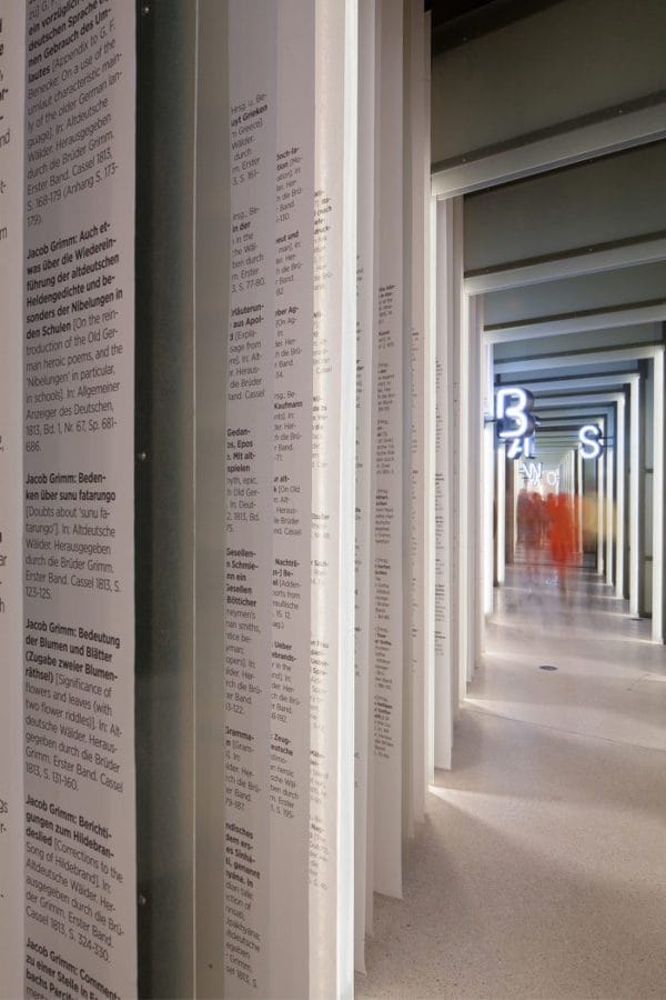 Im Ergebnis misst der Grimm 33 Bände, 67.744 Textspalten, mehr als 320.000 Stichwörter und rund 84 kg. Einige Meter weiter, hinter buchseitenartigen Vorhängen, liegt der Eingang zur Schatzkammer der Ausstellung: Hier werden fünf historische Ausgaben der Grimmschen Märchen gezeigt, die sogenannten Handexemplare der Brüder Grimm: Diese Bücher wurden für Jacob und Wilhelm Grimm mit extra breitem Rand für ihre handschriftlichen Kommentare gedruckt. In diesen Arbeitsexemplaren machten die beiden ihre Korrekturen für die heute weltberühmten Kinder- und Hausmärchen, die mittlerweile in über 160 Sprachen übersetzt wurden und auf der ganzen Welt bekannt sind.