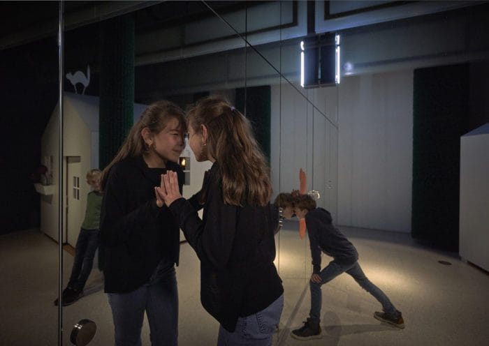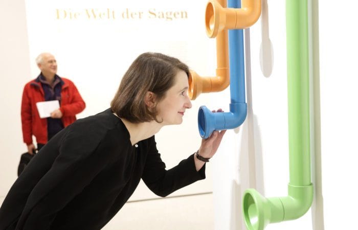 Im oberen Teil der GRIMMWELT ist seit dem 1. Dezember die Sonderschau »HörenSAGEN: Antike Mythen – Grimmsche Sagen – Digitales Erzählen« zu sehen. Die Familienausstellung lädt gleich im Entree zum Mitmachen ein: An der Installation von Ole Werner können die Besucher durch Rohre ihre Botschaften sprechen, ohne zu wissen, wer sie am anderen Ende empfängt – und was er daraus macht. Hörensagen eben. Gleich ein paar Schritte weiter warten Figuren antiker Mythen und deutscher Sagen auf die Kreativität und das Wissen der Besucher.