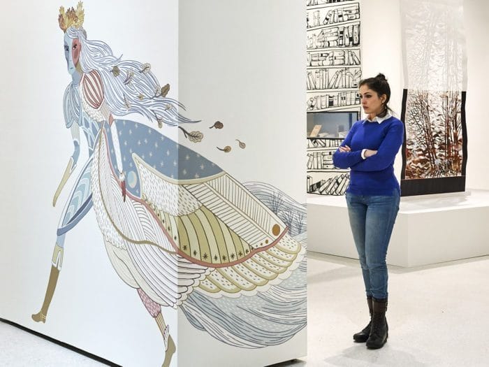 Die Figuren können in ihre tatsächliche Geschichte eingebettet oder zu ganz neuen Erzählungen zusammengestellt werden. Durch raumhohe Bücherwänden hindurch, die die Originale der Grimmschen Sagen von 1816 und 1818 sowie viele weitere Ausgaben lokaler und regionaler Sagen zeigen, schimmert der Papercut der Berliner Künstlerin Katrin Binder: »Hollenteich« greift die tiefgründige und vielschichtige Figur der Frau Holle auf.