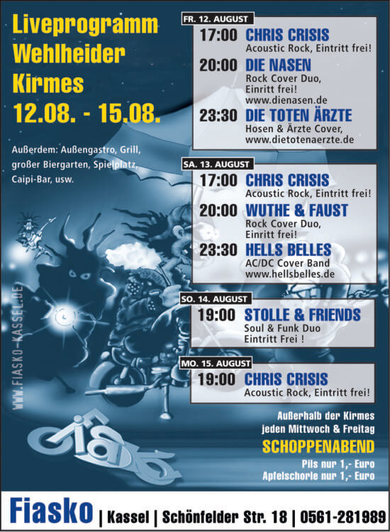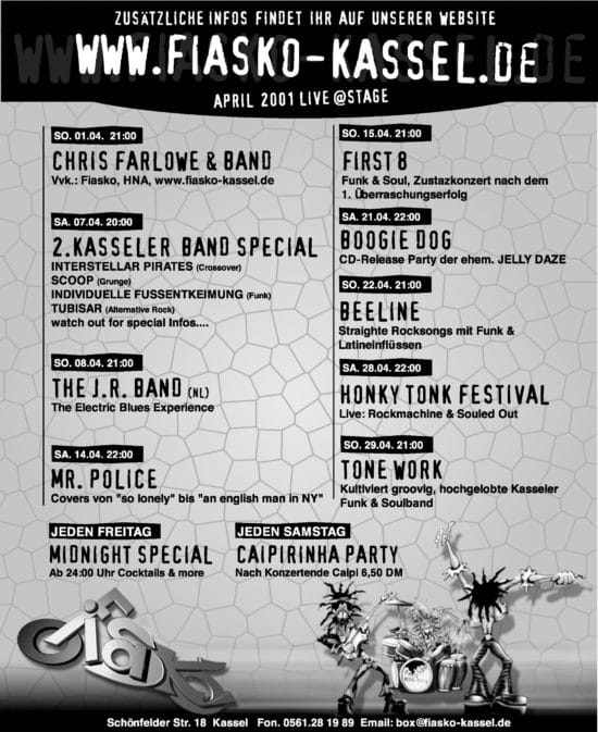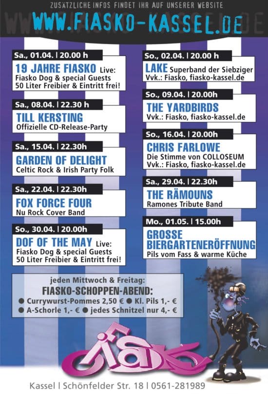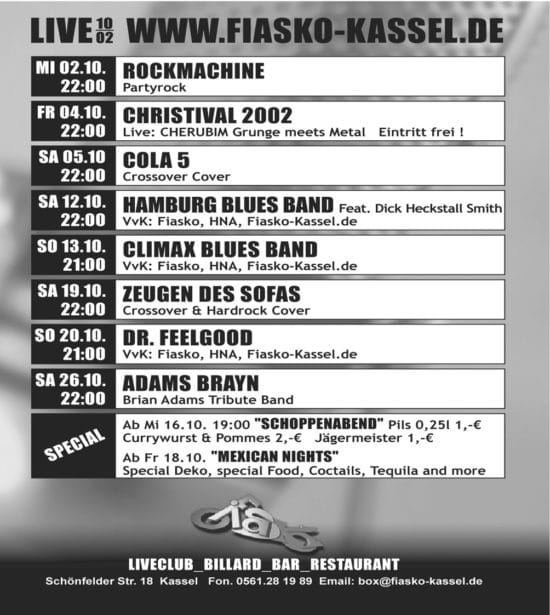 Auch wir trauern, nach dem Verluste des A.R.M. und des Musiktheaters, dem Ballsaal vom Hotel Reiss in dem viele hochkarätige Konzerte stattfanden, nur auch noch über einen der ältesten Live-Klub der Rock-Szene Kassel. Denn ab heißt es leider: (auch) das Fiasko in Kassel ist zu!