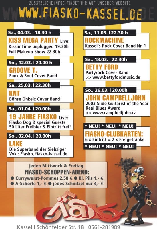 Karsten Köhler, der noch am Abend vorher im Fiasko mit seiner Band Ace Of Spades und vielen anderen Kassel Musikern ein rauschendes Rock-Fest feierte, schrieb uns zum Thema Fiasko-Schließung: