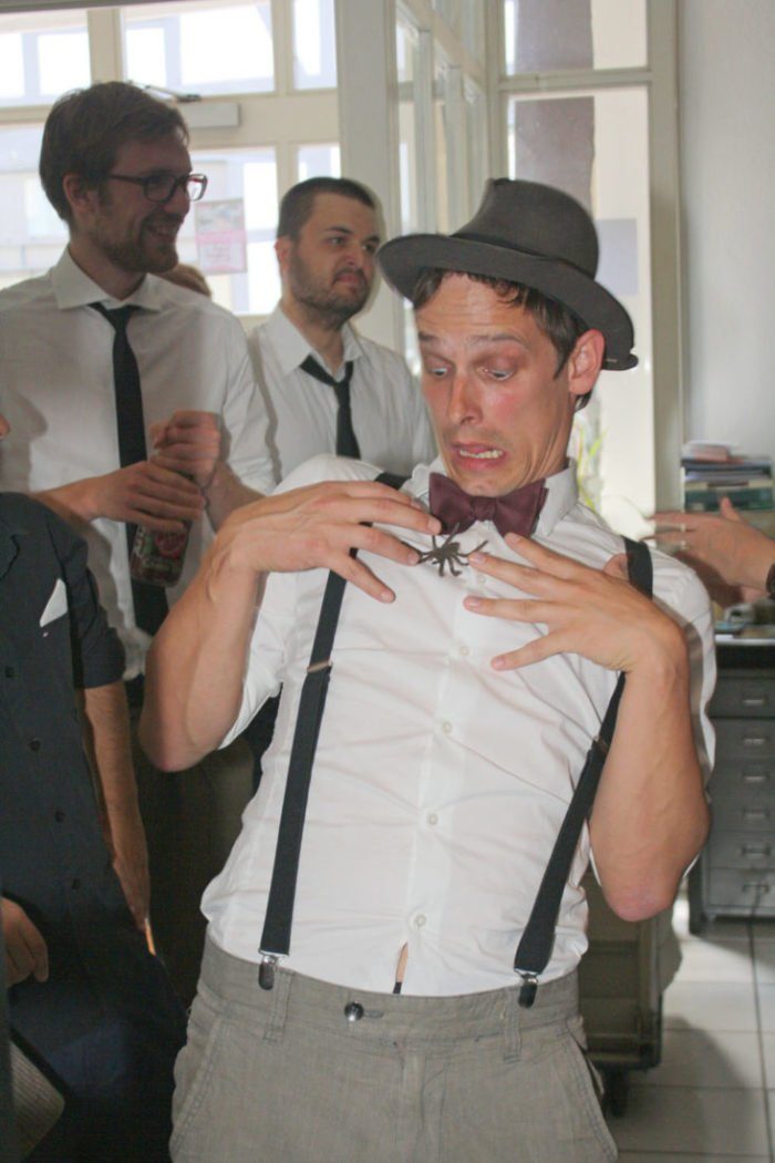 Da wird unser Büro rasch noch kleiner, mit sechs weiteren Personen! Doch schick sind sie, in Anzügen und Sebastian Dey mit Hut und Fliege. Neugierig begutachten sie unser Sammelsurium von Büchern, Ordnern und Promoartikeln, spielen mit einer Plastikspinne, blödeln herum. Viel Spaß mit den fünf Herren und der Dame vom Expeditionsteam hatten wir, als sie überraschend unsere Redaktion stürmten.