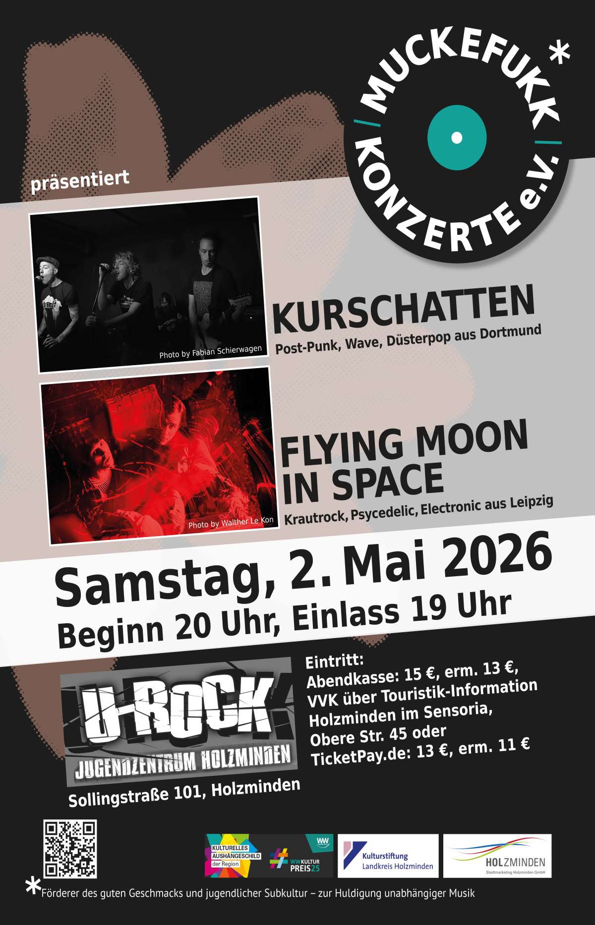 Eintritt: 15,00 € (AK) | 13,00 € (VVK) | 11,00 € (Ermäßigt) Hier gibt es die Tickets für Flying Moon In Space / Kurschatten in HolzmindenEvent auf Facebook